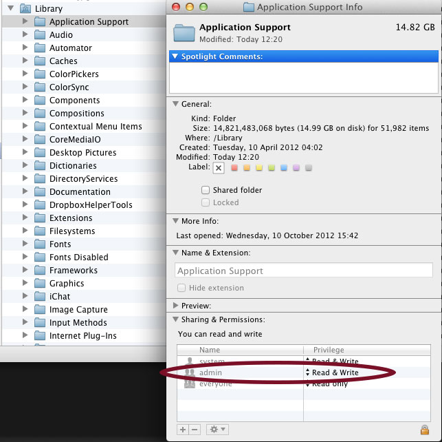 So… navigate to /Library/Application Support and hit cmd+I to see the properties. Click the padlock (and enter your password if prompted). Change the permissions from Read Only to Read & Write and you’re done.